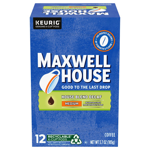 99.7% caffeine free. Keurig Genuine K-Cup Pods. Good to the last drop. The perfect balance of strength & flavor. Delightful & lively, from our house to yours. Roasted in the USA since 1892. Trusted by generations of coffee drinkers. Only genuine K-Cup pods are optimally designed by Keurig for your Keurig coffee maker to deliver the perfect beverage in every cup. For use in all Keurig K-Cup brewers. www.maxwellhouse.com. how2recycle.info. Find us on Facebook.com/Keurig or Twitter.com/Keurig. To learn more, visit Keurig.com/GenuineK-CupPod. For more information contact: Kraft Heinz Foods Company. Chicago, IL 60601. 1-888-496-0018. www.maxwellhouse.com. www.myfoodandfamily.com. For brewer inquiries contact: 1-866-901-BreWith 1-866-901-2739. www.Keurig.com. Recyclable (Not recycled in all communities) K -Cup Pods. Peel, empty, recycle. Peel: Starting at puncture peel lid and dispose. Empty: Compost or dispose of grounds. (filter can remain). Recycle: Check locally (not recycled in all communities) to recycle empty cup. Visit Keurig.com/recyclable to learn more. how2recycle.info.