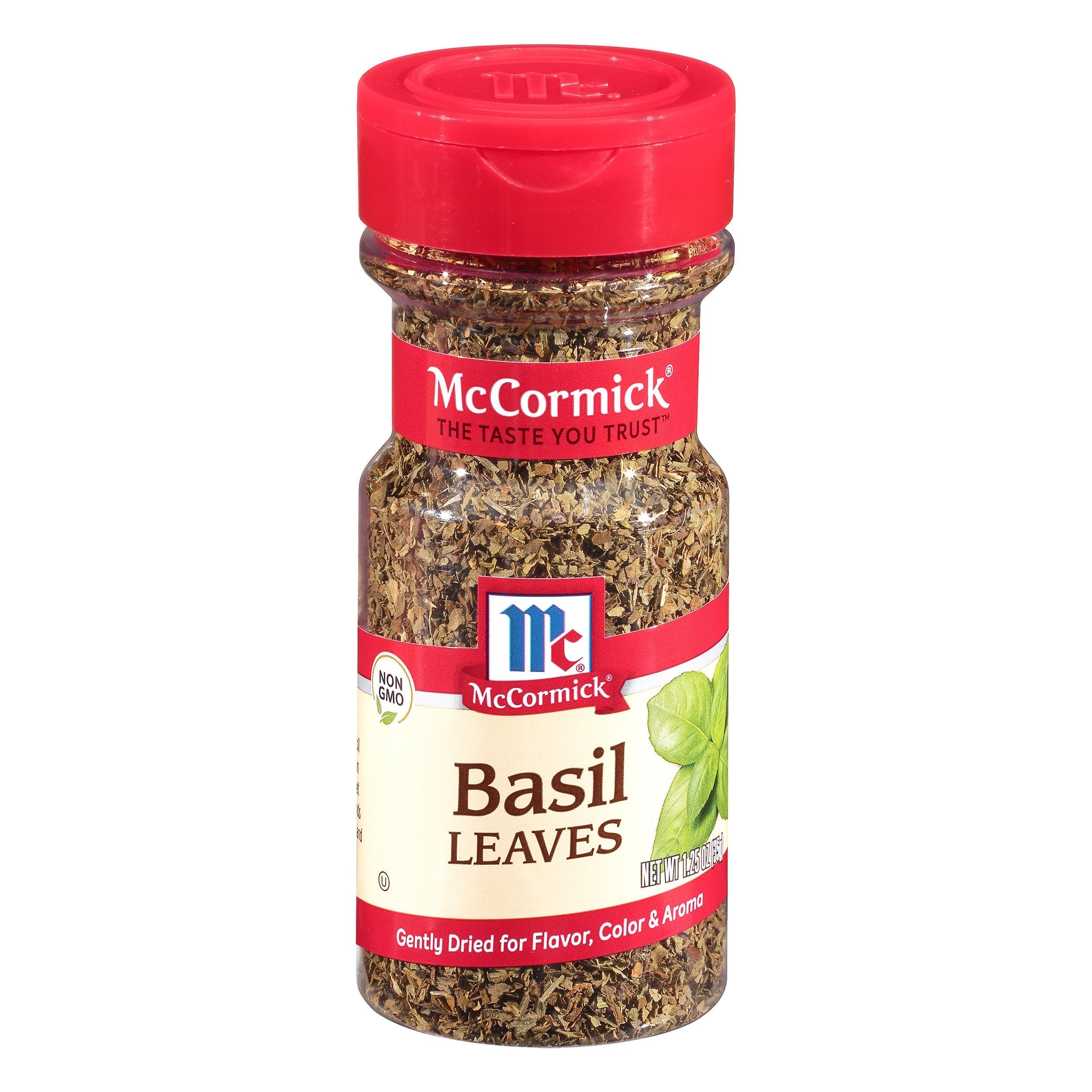 Non GMO. The taste you trust. Gently dried for flavor, color & aroma. Our Whole Basil Leaves have an aromatic sweet flavor that blends well with garlic and tomatoes. mccormick.com. SmartLabel. Questions? Call 1-800-632-5847. Packed in USA.