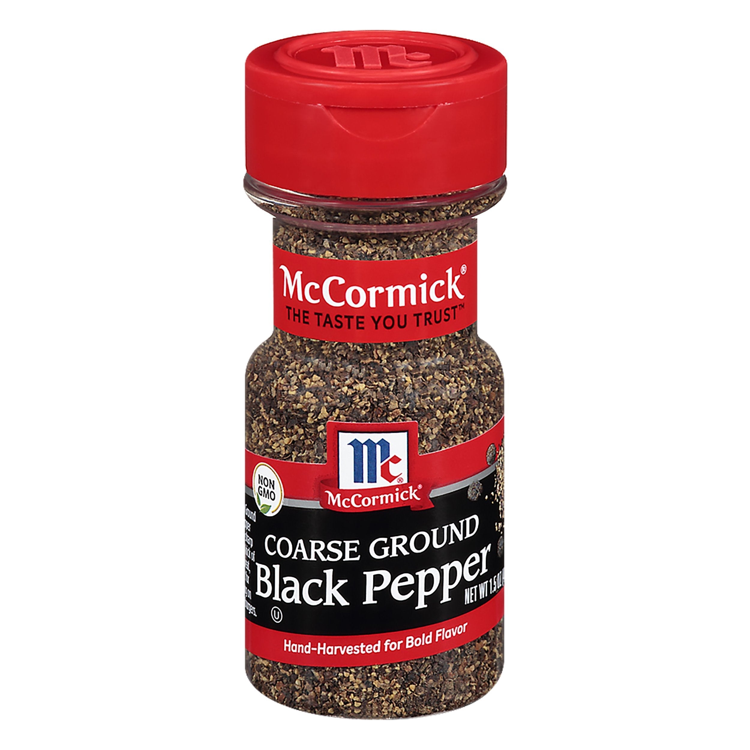 Non GMO. The taste you trust. Hand-harvested for bold flavor. Our Course Ground Black Pepper delivers a sharp aroma and kick of earthy heat, perfect for sprinkling on steak and burgers. mccormick.com. SmartLabel. Questions? Call 1-800-632-5847. Packed in USA.