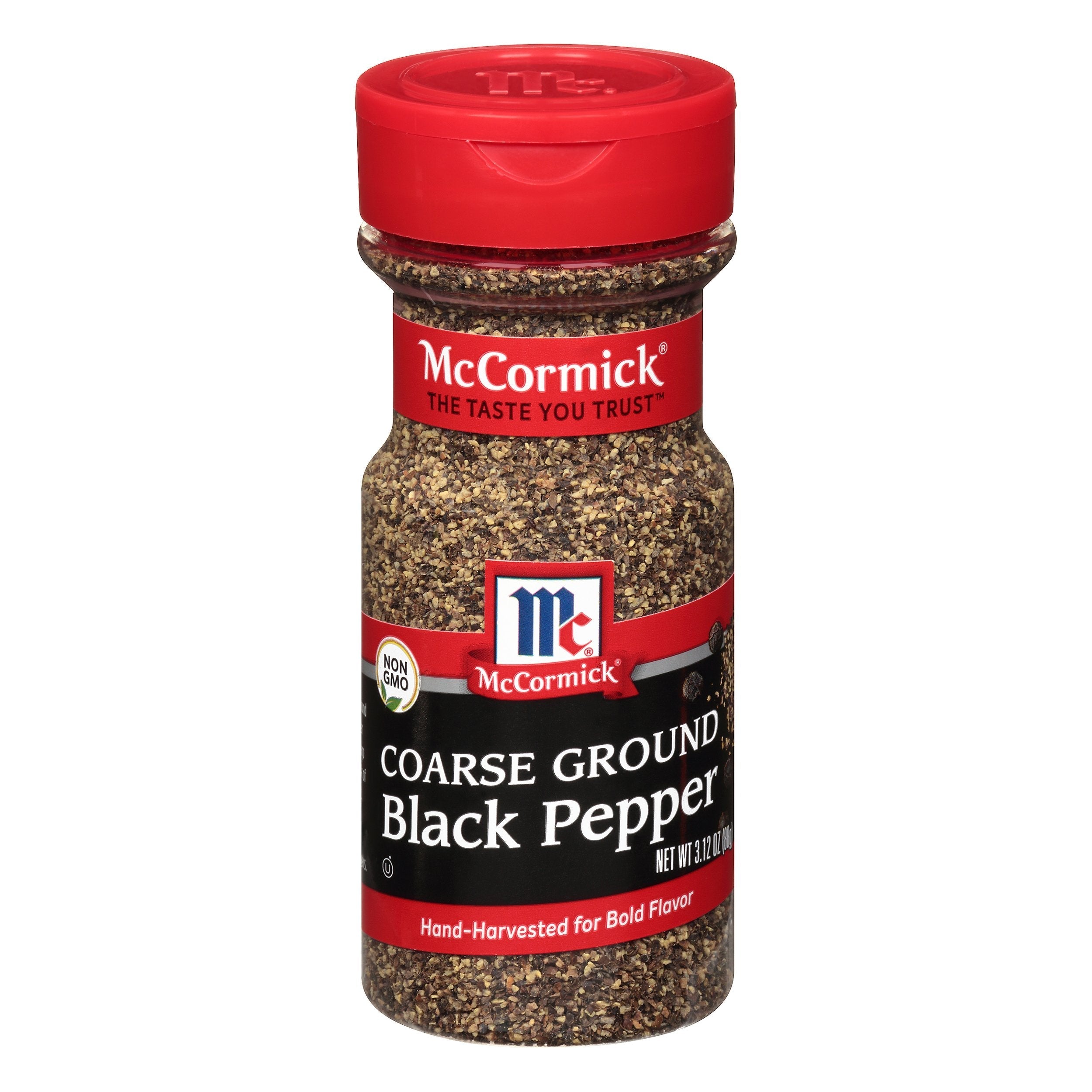 Non GMO. The taste you trust. Hand-harvested for bold flavor. Our Course Ground Black Pepper delivers a sharp aroma and kick of earthy heat, perfect for sprinkling on steak and burgers. mccormick.com. SmartLabel. Questions? Call 1-800-632-5847. Packed in USA.
