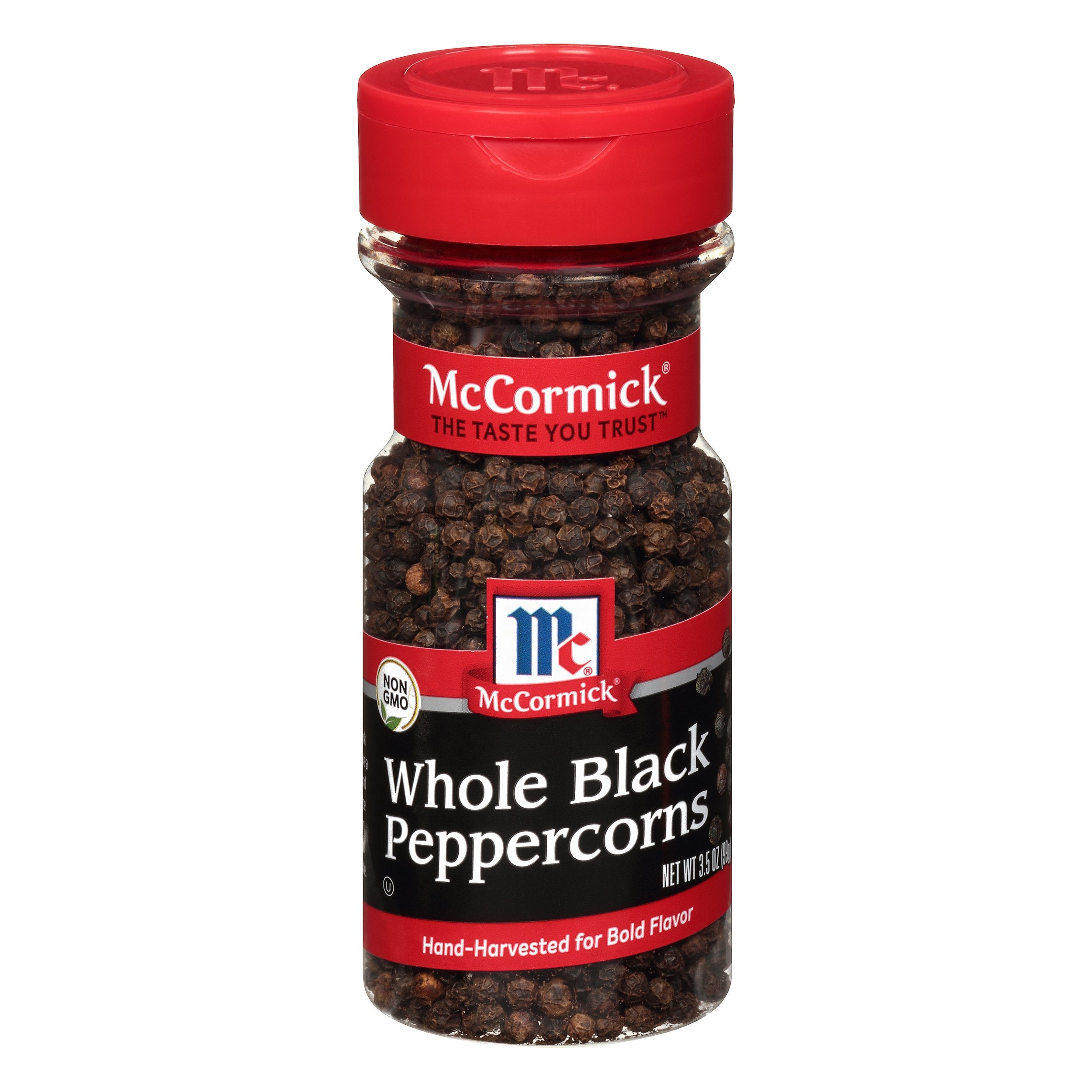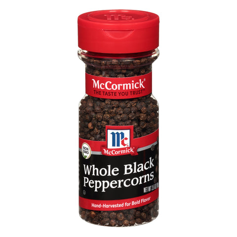 Non GMO. The taste you trust. Hand-harvested for bold flavor. Our Whole Black Peppercorns have a sharp aroma and earthy heat. Use them whole in brines or grind fresh at the table. mccormick.com. SmartLabel. Questions? Call 1-800-632-5847. Packed in USA.
