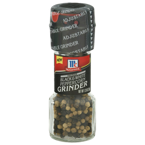 Adjustable grinder. New. This blend of black and white peppercorns gives food an earthy, spicy kick. www.mccormick.com. For recipes, visit www.mccornmick.com questions? call 1-80-632-5847. Packed in France.