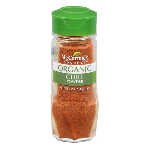 USDA Organic. Certified Organic By QAI. Non GMO project verified. nongmoproject.org. This organic blend of chili pepper, garlic and other spices gives a deep rich flavor and color to Southwestern dishes and grilled or roasted meats. Filled by weight. Settling may occur. For nutrition information, contact. mccormickgourmet.com or call 1-800-632-5847. Packed in USA.