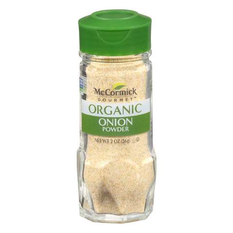 USDA Organic. Certified Organic by QAI. Non GMO Project verified. nongmoproject.org. Filled by weight. Settling my occur. Onion powder makes it easy to add savory richness to just about any dish - from dips to soups, sauces, vegetables, chicken and burgers. mccormickgourmet.com. mccormickgourmet.com or call 1-800-632-5847. Packed in U.S.A.