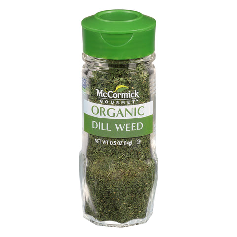 USDA Organic. Certified Organic by QAI. Non GMO Project verified. nongmoproject.org. The feathery leaves of the dill plant add fresh green flavor to lighter dishes such as salads, seafood and vegetables. Also try in dips and pickles. Filled by weight. Settling may occur. mccormickgourmet.com. mccormickgourmet.com or call 1-800-632-5847. Packed in USA.
