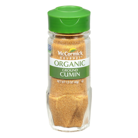 USDA Organic. Certified Organic by QAI. Non GMO Project verified. nongmoproject.org. Filled by weight settling my occur. Cumin's earthy flavor is a must for India curries, Middle Eastern couscous and hummus, Mexican tamales, and Tex-Mex chili, tacos and fajitas. mccormickgourmet.com. Mccormickgourmet.com or call 1-800-632-5847. Packed in Canada.
