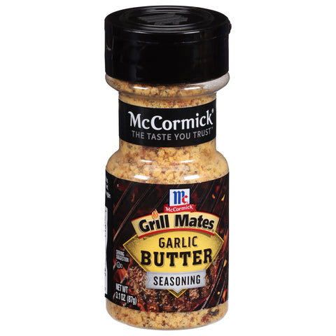 The taste you trust. All it takes is flame & flavor. Shake this savory blend of garlic and butter on steaks, burgers, chicken, seafood and veggies. www.grillmates.com. Comments or questions? Call 1-800-632-5847. For more recipes, visit www.grillmates.com. For nutrition information contact: Dist. by McCormic & Co., Inc. Hunt Valley, MD 21031-1105. Packed in U.S.A.