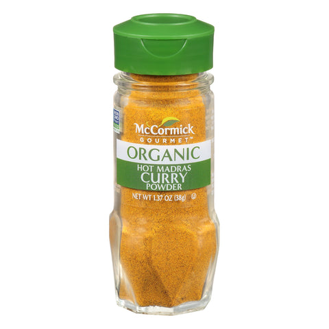 USDA Organic. Certified Organic by QAI. Non GMO Project verified. nongmoproject.org. Renowned in the Madras region of India, this blend of organic spices balances heat with intense flavor. Use for spicy curries. Filled by weight. Settling may occur. mccormickgourmet.com or call 1-800-632-5847. Packed in USA.