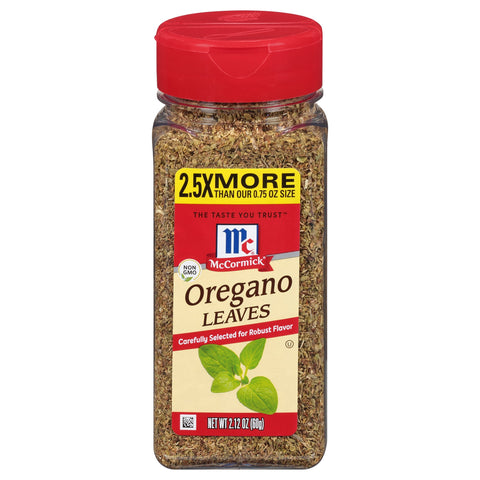 Non GMO. 2.5x more than our 0.75 oz size. The taste you trust. Carefully selected for robust flavor. Our Oregano Leaves have a peppery bite and a sweet, slightly minty aroma that's perfect for tomato dishes. mccormick.com. SmartLabel. Find recipes for all American chili, lemon herb green beans and roasted Italian vegetables on our website. Questions? Call 1-800-632-5847; For recipes visit mccormick.com. Packed in U.S.A.
