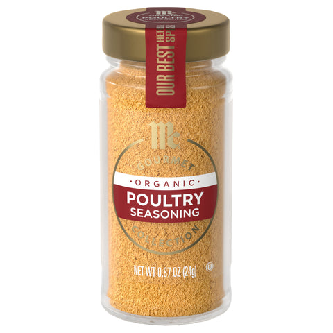 Discover our finest flavors with the McCormick Gourmetâ„¢ Collection of our best herbs and spices, including McCormick Gourmet Collection Organic Poultry Seasoning. Poultry seasoning brings exceptional taste to your table with its herbaceous notes, versatility, and assurance of being organic, non GMO, and kosher. This pantry staple is a traditional blend of thyme, sage, oregano, black pepper, and nutmeg. With its savory, herbaceous flavor, our poultry seasoning brings the taste of Thanksgiving to holiday classics like roast chicken, roast turkey, stuffing, gravy, and pot pie. Use it in baked chicken, pot pie, meatloaf, or chicken salad. It also makes a robust rub for pork and lamb, while adding depth to soups, vegetables, and roasted potatoes.