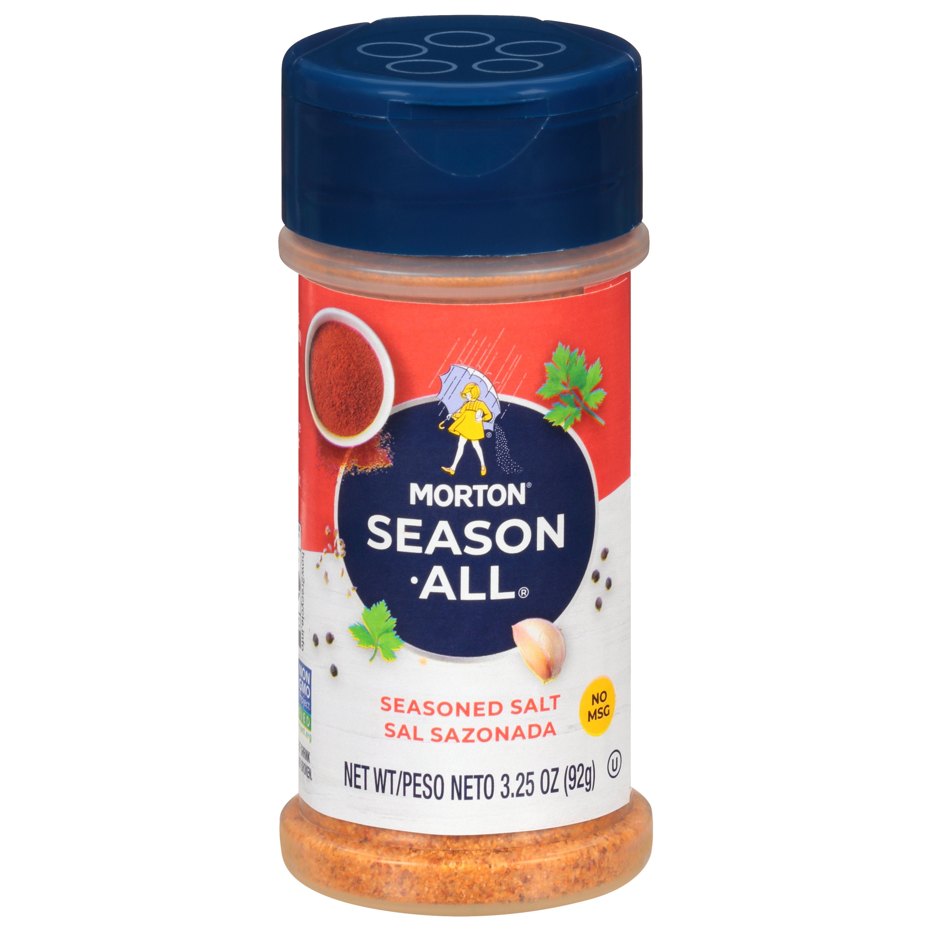 Non GMO Project verified. nongmoproject.org. No MSG. Add a dash of flavor with Season-All Seasoned Salt - a delicious blend of: salt, spices and a hint of chili pepper. Sprinkle it on: meat, vegetables, sides. www.mortonsalt.com. how2recycle.info. Facebook: Facebook.com/mortonsalt. Instagram: Instagram(at)mortonsalt. For recipes and to learn more about our culinary salts visit www.mortonsalt.com.