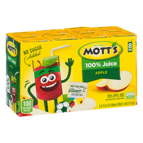 100% apple juice from concentrate with added vitamin C. No artificial flavors, colors or sweeteners. 100% DV vitamin C per juice box. 100 calories per box. Gluten free. No sugar added. Not a low calorie food. See nutrition panel for information on calorie and sugar content. Non GMO (Non-GMO/GE. Certified by NSF. www.nsfnongmo.org). Since 1842. 1-1/2 servings of fruit (provides 1-1/2 servings of fruit per juice box. Current USDA dietary guidelines recommend a daily intake of 2 cups of fruit for a 2,000 calorie diet. 1 serving = 1/2 cup) per juice box. Unsweetened. Pasteurized. Mott's.com. Let's Play. letsplay.com.