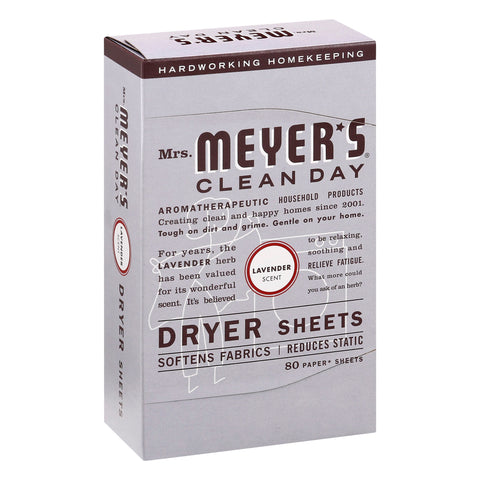 Hardworking homekeeping. Clean day. Aromatherapeutic household products. Creating clean and happy homes since 2001. Tough on dirt ad grime. Gentle on your home. For years, the lavender herb has ben valued for its wonderful scent. It's believe to be relaxing soothing and relieve fatigue. What more could you ask of an herb? Softens fabrics. Reduces static. 80 paper (Our paper dryer sheets are compostable and recyclable) sheet. We make effective, trusted formulas. Made with: plant derived softeners; natural essential oils. Made without: animal derived ingredients; artificial colors; phthalates. Product ingredients are at least 99% natural derived. Mrs.meyers.com. Box is made with at least 35% recycled paper too. Cruelty free.