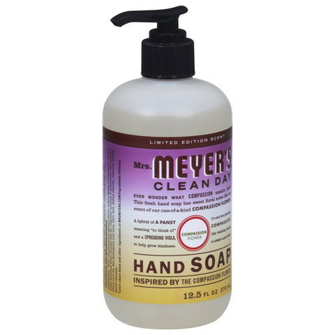 Limited Edition Scent Ever wonder what compassion smells like? This fresh hand soap has sweet floral notes like the scent of our one-of-a-kind compassion flower. A hybrid of a pansy meaning to think of and a spreading viola, to help grow kindness. It's said that practicing compassion, like washing hands, is always a good habit. Hand soap inspired by the compassion flower. The Compassion Flower Story: Can a seed help grow a kinder world? There's a Saying in Gardening: If a plant doesn't grow well, don't blame the plant, try to understand why. Same with people. Empathy is the key to growing better relationships. We created The Compassion Flower to help spread a little understanding in a world that sure could use it. Seems simple, but like most good things, a kinder, gentler world really can start in your own backyard. We make effective, trusted formulas. Made with (Learn about these and other ingredients at mrsmeyers.com/ingredients-glossary): Plant-derived cleaning ingredients. Essential oils. Glycerin. Made without: Parabens & phthalates. Artificial colors. MEA & DEA. mrsmeyers.com. how2recycle.info. To learn more visit mrsmeyers.com. Bottle (less pump) are made with at least 30% post-consumer plastic. Cruelty free. Contents are biodegradable.