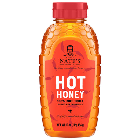 100% pure honey infused with chili pepper. Gluten free. Thy word is sweeter than honey. Ps. 119:103. Crafted for exceptional taste. A mission-driven company that gives back. Nature Nate's Hot Honey pairs the award-winning taste of our 100% pure honey with just the right kick. Infused with a balanced chili flavor, this sweet and spicy all-natural blend enhances every bite with just a little drizzle. Try topping pizza or biscuits with it for a sweet kick. Thank you for allowing us to serve you and your family - Nate. naturenates.com. BPA free.