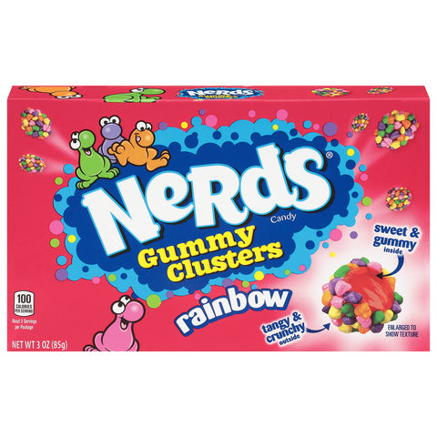 Naturally & artificially flavored. 100 calories per serving. About 3 servings per package. Sweet & gummy inside. Tangy & crunchy outside. Rainbow Nerds surround fruity, gummy centers. Those sweet little sparks are fantastic inventors. A poppable cluster, packed with tangy, crunchy Nerds. A candy so tasty, there aren't even words. www.nerdscandy.com. Facebook. Instagram. Smartlabel: Scan code for more food information or call 1-800-280-6934. Get in touch: 1-800-280-6934 or go to www.nerdscandy.com. Please have package available when reaching out. Please recycle this carton.