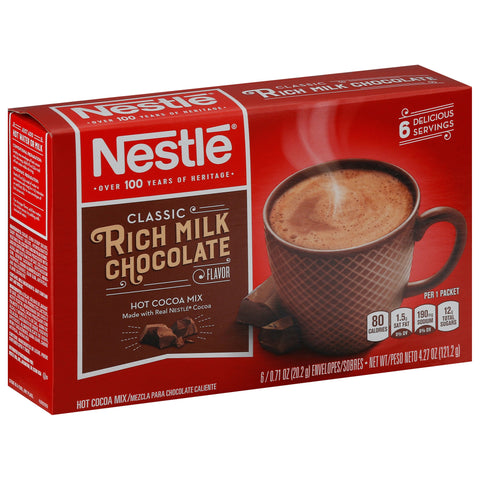 Per 1 Packet: 80 calories; 1.5 g sat fat (8% DV); 190 mg sodium (8% DV); 12 g total sugars. Nutritional Compass: Nestle - Good food, good life. Good to Know: Nestle Rich Milk Chocolate Hot Cocoa Mix is not only good fo cold winter days. It can be enjoyed with family and friends all year long. Thoughtful Portion: 1 pk + 6 oz = 1 portion. Good to Connect: NestleUSA.com. Text/call 1-800-879-7275. 99.9% caffeine free. Nutrition facts are per 8 fl oz hot cocoa. As required by FDA regulations. Nutrition values are less for 6 fl oz when prepared as directed. Over 100 years of heritage. 6 delicious servings. Made with real Nestle Cacao. Over 100 years of chocolatey memories. Our sustainably-sourced cocoa beans produce a smooth and delicious hot cocoa ready in seconds. We look forward to being your hot cocoa of choice for your family traditions and memories for years to come. www.nestlecocoaplan.com. NestleUSA.com. Cocoa Plan: Supporting farmers for better chocolate. The Nestle Cocoa Plan works with UTZ to help improve the lives of cocoa farmers and the quality of their products. www.nestlecocoaplan.com Carton made with 100% recycled paperboard minimum 35% post consumer content.