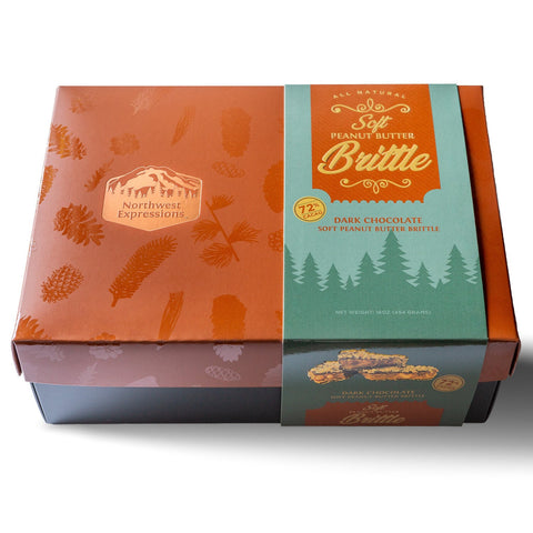 CHOCOLATE COVERED BRITTLE: Our Dark Chocolate Soft Peanut Brittle is handmade with quality peanut butter, pure sugars and peanuts, all slowly heated in an old fashioned copper pot. ARTISAN SOFT BRITTLE: With a soft, flaky texture and intense flavor, our gourmet small batch home made brittle is then dipped in dark chocolate for an intensely decadent finish. ALL NATURAL RECIPE: The homemade gourmet peanut candy is made with kosher dairy products and natural ingredients, and the soft brittle is also gluten free. GOURMET GIFTS: Share the Peanut Brittle love this decadent chocolate covered brittle is supplied in an elegant custom gift box with triple-laminated pouches to seal in the freshness. HANDMADE IN THE USA: Northwest Expressions hand crafts gourmet chocolates, exquisite cookies, decadent confections and savory popcorn on Harstine Island in beautiful Washington State.
