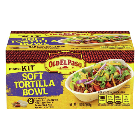 Kit Includes: 8 Flour tortilla bowls, mild taco sauce, seasoning mix. Per 2 Tacos as Packaged: 190 calories; 2.5 g sat fat (13% DV); 840 mg sodium (37% DV); 2 g total sugars. See nutrition information for as prepared information. Partially produced with genetic engineering. Established 1938. Just add meat & toppings. www.oldelpaso.com. generalmills.com. how2recycle.info. To get inspired, visit us at www.oldelpaso.com. Questions or comments? Call 1-800-300-8664 Mon - Fri 7:30 am - 5:30 pm CT. Information from the package will be helpful. Old El Paso Consumer Relations PO Box 200, Minneapolis, MN 55440. Learn more at Ask.GeneralMills.com. Box Tops for Education: No more clipping. Scan your receipt. See how at btfe.com. Proud sponsor of Celiac Disease Foundation. celiac.org. 100% recycled paperboard.