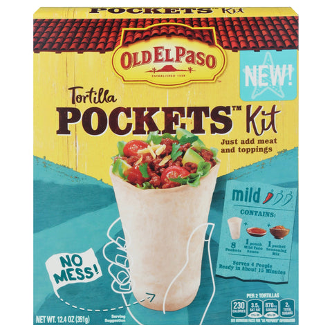 Per 2 Tortillas: 230 calories; 3.5 g sat fat (17% DV); 870 mg sodium (38% DV); 2 g total sugars. See nutrition facts for as prepared information. Contains bioengineered food ingredients. Learn more at Ask.GeneralMills.com. Established 1938. New! Just add meat and toppings. Contains: 8 pockets + 1 pouch mild taco sauce + 1 packet seasoning mix. Serves 4 people. Ready in about 15 minutes. No mess! Also great for: breakfast; lunch; on-the-go. www.oldelpaso.com. how2recycle.info. Visit www.oldelpaso.com for recipes and inspiration! Questions or comments? Call 1-800-300-8664. Information from the package will be helpful. 100% recycled paperboard. Product of Mexico.