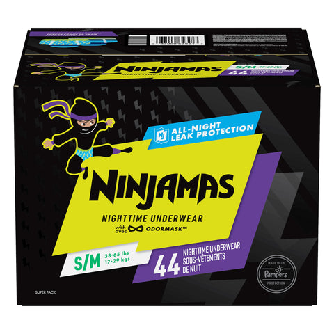17-29 kgs. All-night leak protection. With odormask. Made with Pampers protection. The La Brigade Ninjamas Squad: Master Zeez. Noleak. Sweet Dreams. Sha-Doze. Defenders of the night, Ninjamas help you sleep tight. Ninjamas are a brave squad of stealthy sidekicks who live in an alternate dimension between dusk & dark. They swoop in to help you sleep confidently - so you can wake up feeling great! Formfit waistband. Odormask technology. Pampers lockaway channels. Quietcloth material. Breathable comfort. 0% Parabens & latex (Natural rubber). Contains 2 package liners of 22 absorbent underwear each. Package liners are not intended for individual retail sale. Made with a light fresh scent. Underwear-like designs. If you notice gel-like material on your child's skin, don't be alarmed. This comes from the nighttime underwear padding and can be easily removed by wiping your child's skin with a soft, dry cloth. ninjamas.co. how2recycle.info. Would love a little shout-out! Scan to leave a review. For more information on our product, please consult ninjamas.co or call 1-833-Ninjama. Want to know more about the materials we use? Visit ninjamas.co; 1-833-Ninjama; 1-833-646-5262. Made in USA from domestic and imported materials.