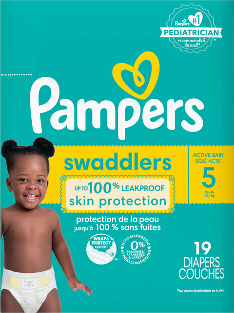 Pampers no.1 pediatrician recommended brand (Based on a 2020 survey of US & Canadian pediatricians). Active baby. Up to 100% Leakproof skin protection. Wrap & protect system. Works together to protect baby's skin. Hypoallergenic. 0% Parabens & Latex: Latex-natural rubber. As always, made with a Pampers light scent. Skin Health Alliance - Dermatologist Approved. how2recycle.info. Pampers.com. For more information on common diapering questions such as choosing the right Pampers product for your baby, preventing diaper leaks, diaper rash and potty training, please consult Pampers.com or call 1-800-Pampers. Want to know more about the materials we use? Visit: pampers.com. Questions? 1-800-Pampers (1-800-726-7377). Pampers Club: Download. Scan. Save. Valid in the US, Canada and PR. how2recycle.info. Made in USA from domestic and imported materials.