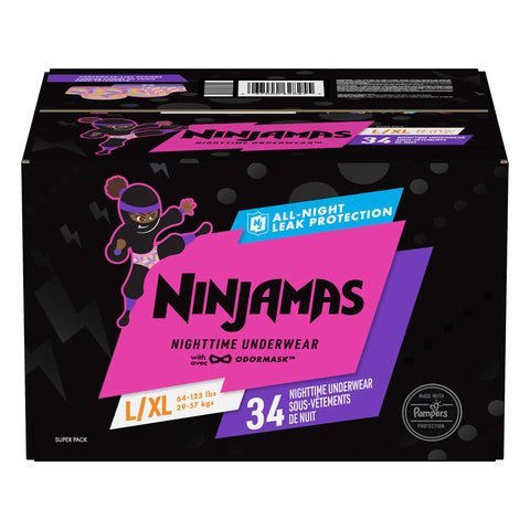 All-night leak protection. With odormask. Made with Pampers protection. Underwear-like designs. If you notice gel-like material on your child's skin, don't be alarmed. This comes from the nighttime underwear padding and can be easily removed by wiping your child's skin with a soft, dry cloth. Defenders of the night, Ninjamas help you sleep tight. Ninjamas are a brave squad of stealthy sidekicks who live in an alternate dimension between dusk & dark. They swoop in to help you sleep confidently - so you can wake up feeling great! Formfit waistband. Odormask technology. Pampers lockaway channels. Quietcloth material. Breathable comfort. Parabens & latex (Natural rubber). Contains 2 package liners of 17 absorbent underwear each. Package liners are not intended for individual retail sale. Store unopened liners in outer box. Made with a light fresh scent.