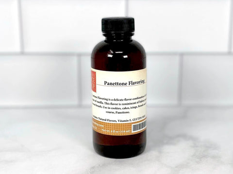 Our Panettone Flavoring is a delicate flavor combination of citrus with a hint of vanilla. This flavor is reminiscent of Italian pastries and sweet breads. Use in cookies, cakes, icings, breads and of course, Panettone.