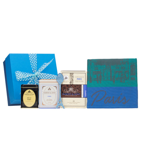 We're pleased to reintroduce the new version of our Paris Tea Gift, now featuring more tea. It's perfect for anyone who loves the City of Lights! Paris, a fruity black tea blend with bergamot, has become one of our most beloved teas around the world. Packaged in a lovely box with a bow, our gift includes Paris Classic tea sachets (ideal for home), Paris Wrapped tea sachets (ideal for travel), a tin of Decaf Paris loose tea (to unwind at the end of a long day), a Paris tea towel, and an Eiffel Tower spoon. Très-bien!