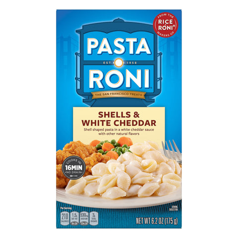 Shell shaped pasta in a white cheddar sauce with other natural flavors. Per Serving: 210 calories; 1.5 g sat fat (9%DV); 530 mg sodium (23%DV); 3 g total sugars. From the makers of Rice a Roni. Est 1958. The San Francisco treat. Cooks in 13 min. Package contains empty space to accommodate pasta to seasoning ratio. This package is sold by weight, not by volume. Contents may settle during shipping and handling. pastaroni.com. how2recycle.info. SmartLabel: Scan for more food information or call 1-800-421-2444. Find more ideas at pastaroni.com/recipes. We're here to help. Pastaroni.com or 800-421-2444. Please have package available when calling. Try Rice-A-Roni for another easy homemade meal. Package contains empty space to accommodate pasta to seasoning ratio. This package is sold by weight, not by volume. Contents may settle during shipping and handling.