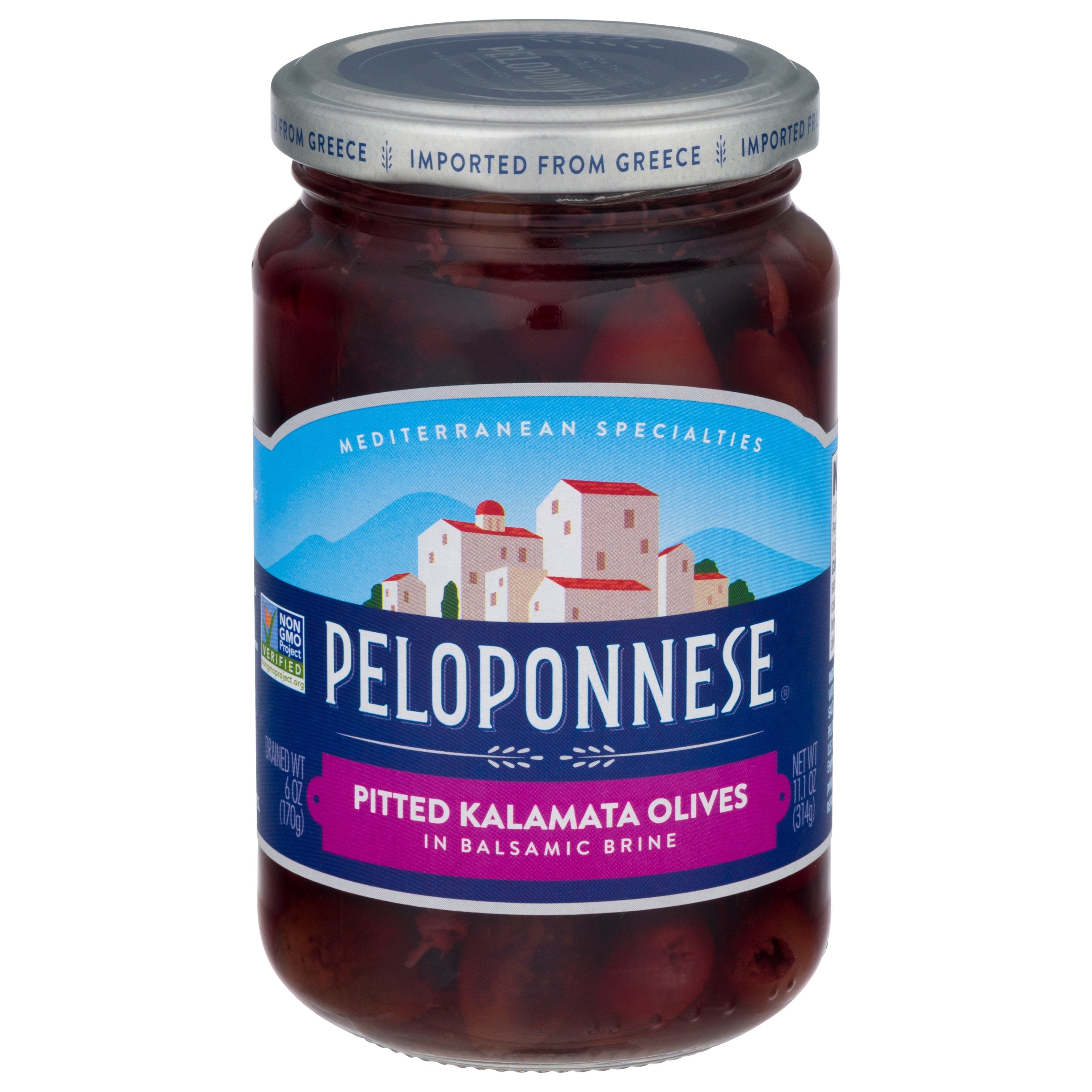 Pitted kalamata olives in balsamic brine. Gluten free. Non GMO Project verified. nongmoproject.org. Mediterranean specialties. Our Greek Kalamata Olives are grown on local family farms, tree ripened in the Mediterranean sun, and cured for months in our exclusive brine recipe (often used for vinaigrette). No artificial ingredients. peloponnese.com. nongmoproject.org. From the award winning kitchens of Peloponnese Mediterranean specialties. Imported from Greece.
