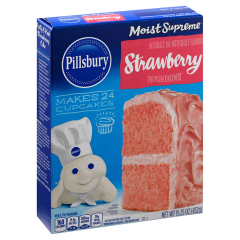Naturally and artificially flavored. Per 1/10 Package: 160 calories; 0.5 g sat fat (3% DV); 360 mg sodium (16% DV); 19 g total sugars. See nutrition facts for prepared product information. Contains a Bioengineered food ingredients. Makes 24 cupcakes. Pretty & pink strawberry cake. Frosting not included. PlilsburryaBaking.com. Facebook. Instagram. Pinterest. Questions or comments? 1-800-767-4466 Package information will be helpful when contacting us. at PlilsburryaBaking.com. Inspiration and tips at PlilsburryaBaking.com. Made with 35% recycled fiber.