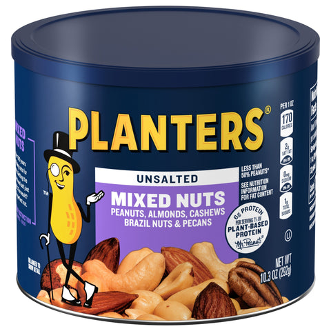 Peanuts, almonds, cashews, brazil nuts & pecans. 6 g protein per serving, Plant-Based protein - Mr.Peanut. Per 1 oz: 170 calories; 2 g sat fat (9% DV); 0 mg sodium (0% DV); 1 g total sugars. Less than 50% peanuts (nuts are measured by weight). See nutrition information for fat content. Please include code number from bottom of can in all correspondence. Mixed Nuts: Over 100 years of being nuts for nuts. Getting the crunch and salt just right. The result? The perfect nut. Nuts of distinction since 1906. planters.com. Visit us at: planters.com 1-877-677-3268 please have package available. Contains Product From: Bolivia, India, Indonesia, Mexico, Mozambique, Nigeria, U.S.A, Vietnam.