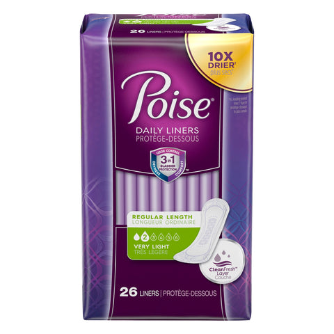 10x drier (vs. leading period liner). 3 in 1 Bladder Protection: Odor control. Dryness. Comfort. CleanFresh layer. Trusted 3-in-1 protection. 1. Comfort: Incredibly thin and stays in place. 2. Dryness: CleanFresh layer helps keep your fresh and dry all day. 3. Odor Control: Absorb-loc core quickly locks away wetness and odor. Individually wrapped. Poise Liners: 2 (your product); very light; spurts. poise.com. how2recycle.info. 1-800-340-3102 Consumer Services, Kimberly-Clark Corp. Dept. PLRGT-26 PO Box 2020, Neenah, WI 54957-2020 USA. Love Poise products? Leave a review at poise.com. Discard in trash. Dispose of properly. Made in China.