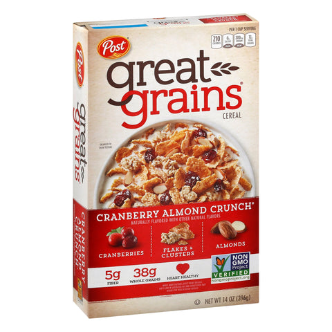 Naturally flavored with other natural flavors. 5 g fiber. 38 g whole grains. Per 1 Cup Serving: 210 calories; 0 g sat fat (0% DV); 200 mg sodium (9% DV); 12 g total sugars. Heart Healthy: While many factors affect heart disease, diets low in saturated fat and cholesterol may reduce the risk of heart disease. 50%+ Whole Grain 38 g or more per serving. 50% or more of the grain is whole grain. WholeGrainsCouncil.org. Good source of fiber. Non GMO Project verified. nongmoproject.org. Cranberries. Flakes & clusters. Almonds. Absolutely delicious and now. Made with 38 g whole grains. Every bowl contains 12 essential vitamins & minerals. greatgrains.com. postconsumerbrands.com. Visit us for more information at: greatgrains.com. Visit us at: postconsumerbrands.com or call weekdays: 1-800-431-POST (7678) please have package available. This paperboard carton is 100% recyclable. Please follow your municipality's instructions for recycling.