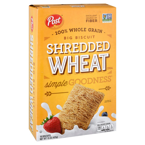 Per 2 Biscuits Serving: 170 calories; 0 g sat fat (0%DV); 0 mg sodium (0%DV); 0 g total sugars. 100% Whole Grain: 51g or more per serving. 100% of the grain is whole grain. WholeGrainsCouncil.org. Excellent source of fiber. Non GMO Project verified. nongmoproject.org. Simple Goodness. Not a low calorie food. We were born to play. We were born to move. We were born to live a full, flavorful life. We were born to Shred. Shredded Wheat. postshreddedwheat.com. postconsumerbrands.com. Visit us at: postconsumerbrands.com or call weekdays: 1-800-431-POST (7678) please have package available. This paperboard carton is 100% recyclable. Please follow your municipality’s instructions for recycling. Product of Canada.