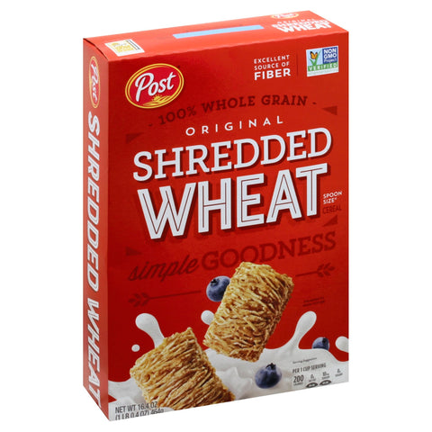 Excellent source of fiber. Non GMO Project verified. nongmoproject.org. Per 1 Cup Serving: 200 calories; 0 g sat fat (0% DV); 10 mg sodium (0% DV); 0 g sugars. 100% Whole Grain: 55 g or more per serving. 100% of the grain is whole grain. WholeGrainsCouncil.org. We were born to play. We were born to move. We were born to live a full, flavorful life. We were to born to shred. postshreddedwheat.com. Visit us at: postconsumerbrands.com or call weekdays: 1-800-431-Post (7678). Please have package available. Carton made from 100% recycled paperboard. Minimum 35% post-consumer content.
