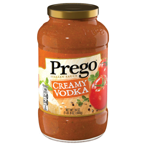 Per 1/2 Cup: 140 calories; 3.5 g sat fat (18% DV); 480 mg sodium (21% DV); 10 g total sugars. Gluten free. Each 1/2 cup of Prego Creamy Vodka Sauce is: 40% of daily vegetables (Each 1/2 cup serving of sauce provides 1 cup equivalent of vegetables. Dietary guidelines recommend 2 1/2 cups of a variety of vegetables per day for a 2,000 calorie diet). The ingredients from corn, sugar and canola in this product come from genetically modified crops. For information about GMO ingredients, visit: WhatsInMyFood.com. www.prego.com. Questions or comments? Call us at 1-888-For-Prego. www.prego.com. Please recycle.