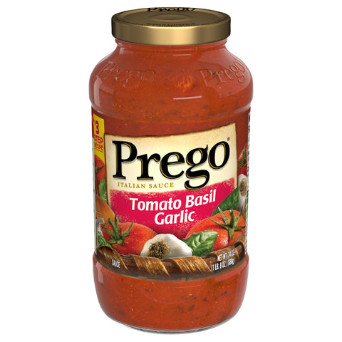 Gluten free. Low fat. Each 1/2 cup of Prego Tomato Basil Garlic Sauce is: 40% of daily vegetables (Each 1/2 cup serving of sauce provides 1 cup equivalent of vegetables. Dietary guidelines recommend-2 1/2 cups of a variety of vegetables per day for a 2,000 calorie diet). Vegetarian. Contains bioengineered food ingredients. The ingredients from sugar and canola in this product come from genetically modified crops. 3 step recipe. how2recycle.info. www.prego.com. Find more recipes at Prego.com/recipes. Questions or comments? Call us at 1-888-for-prego; www.prego.com.