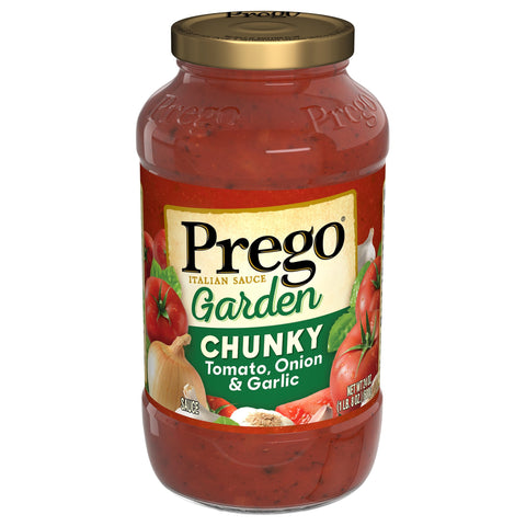 Gluten free. Low fat & low saturated fat. Each 1/2 cup of Prego Garden Chunky Tomato Onion & Garlic Sauce is: 40% of daily vegetables (Each 1/2 cup serving of sauce provides 1 cup equivalent of vegetables. Dietary guidelines recommend 2 1/2 cups of a variety of vegetables per day for a 2,000 calorie diet). Good source of fiber. Contains bioengineered food ingredients. The ingredients from sugar and canola in this product come from genetically modified crops. Celebrate the goodness of vegetables with Prego Garden Chunky Italian Sauce! Made with thick, chunky vegetables and packed with savory herbs and seasonings that will satisfy the whole family. how2recycle.info. www.prego.com. Questions or Comments? Call us at 1-888-For-Prego. www.prego.com.