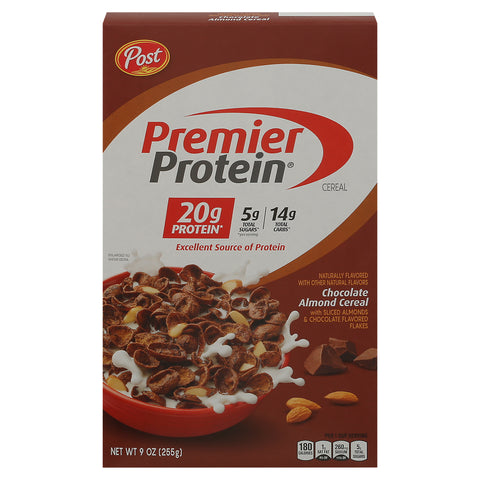 Chocolate almond cereal with sliced almonds & chocolate flavored flakes. Naturally flavored with other natural flavors. 20 g protein (Per serving). 5 g total sugars (Per serving). 14 g total carbs (Per serving). Per 1 Cup Serving: 180 calories; 1 g sat fat (4% DV); 260 mg sodium (11% DV); 5 g total sugars. Excellent source of protein. Contains bioengineered food ingredients. 100% yum. Delicious never tasted so good. postconsumerbrands.com. Learn more of PremierProteinCereal.com. Visit us at: postconsumerbrands.com. or call weekdays: 1-800-431-Post (7678) please have package available. Try our Protein shakes for on-the-go nutrition. Vanilla; Chocolate; Cafe Latte. This paperboard carton is 100% Recyclable. Please follow your municipality's instructions for recycling.