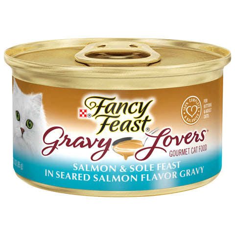 100% complete & balanced. For kittens & adult cats. Purina.com. 1-800-933-0991; Purina.com. Please recycle. Calorie Content (ME, Calculated) 762 kcal/kg, 65 kcal/can. Fancy Feast Gravy Lovers Salmon & Sole Feast in Seared Salmon Flavor Gravy is formulated to meet the nutritional levels established by the AAFCO Cat Food Nutrient Profiles for growth of kittens and maintenance of adult cats.