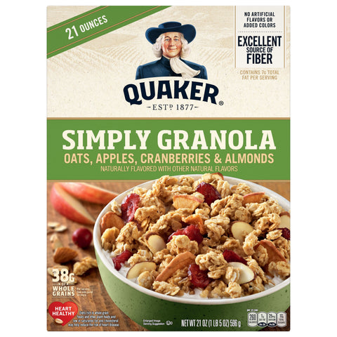 No artificial flavors or added colors. Naturally flavored with other natural flavors. Per 2/3 Cup: 260 Calories; 1 g sat fat (5% DV); 25 mg sodium (1% DV); 17 g total sugars. 38 g of whole grains per serving. See side panel for more. Heart Healthy: Diets rich in whole grain foods and other plant foods and low in saturated fat and cholesterol may help reduce the risk of heart disease. Whole 38 g grains made with 38 g of whole grains (Made with 19g of Whole Grain Oats and 19g of Whole Grain Wheat per serving) which provide energy to help keep you going. Excellent source of fiber. Contains 7g of total fat per serving. Excellent source of fiber (Contains 7g of total fat per serving). 21 Ounces. Estd 1877. Cereal filled to this line. Simply delicious Quaker Simply Granola has the great taste of almonds, apples and cranberries, a satisfying crunch, and genuine whole grain oats. Enjoy with milk, over yogurt, or as a snack on the go. Apple pieces, almonds, whole grain oats, cranberries. Quakeroats.com. Facebook. Twitter. For special offers, information and to join the conversation. visit: QuakerOats.com, Facebook.com/Quaker or (at)Quaker. SmartLabel: Scan here for more food information or call 1-800-234-6281. Try our other delicious flavors: Oats, honey, raisins & almonds. Quaker, simply granola . Oats, honey, raisins & almonds. Oats, honey & almonds Quaker, simply granola. Oats, honey & almonds. Package contains empty space to accommodate product size and/or density variation and to ensure sufficient package sealing. This package is sold by weight, not by volume. Contents may settle during shipping and handling.