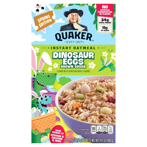 Spring Edition Flavor with other natural flavors. No artificial preservatives or flavors. 34 g whole grains. 11 g of sugar. Per Packet: 190 calories; 2 g sat fat (11% DV); 230 mg sodium (10% DV); 11 g total sugars. 50% Whole Grain: 34 g or more per serving. WholeGrainsCouncil.org. 50% or more of the grain is whole grain. Eat at least three one ounce equivalent (3 servings) of whole grains per day for fiber and overall health. Each oatmeal packet contains a one ounce equipment (1 serving) of whole grains. Good source of vitamin D, Calcium & iron. Estd. 1877. Find your way back to the nest! Start. Did you know? oats are a great way to get whole grains. This oatmeal has 34 g. Triceratops had anywhere between 400 and 800 teeth. Tyrannosaurus rex means Tyrant lizard. Quakeroats.com. how2recycle.info. Facebook. Twitter. For special offers, information & to join the conversation, visit: QuakerOats.com, Facebook.com/Quaker or (at)Quaker. SmartLabel: Scan for more food information or call 1-800-555-6287. We're here to help Quakeroats.com or 800.555.6287. Please have package available when calling.