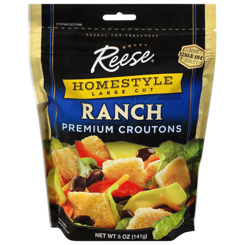 Homestyle large cut. Reseal for freshness. Reese quality since 1947. Croutons have become a standard in salad bowls all over America. But not all croutons are the same. Reese croutons are made from specially formulated dough that allows the crouton to retain the crispness and flavor that crouton lovers seek. Reese croutons are perfect in salads, soups, stuffings, as a casserole topping or as a snack from the bag!. www.ReeseSpecialtyFoods.com. Recipes & more at www.ReeseSpecialtyFoods.com. Try all of our delicious varieties: Homestyle bacon flavored. Homestyle garlic butter. Homestyle garlic & cheese. Homestyle Caesar.