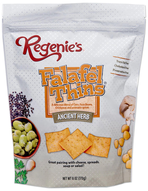 Vendor will ship items in 5-7 days. Regenie's Ancient Herb Falafel Thins cracker, a Mediterranean treat using a natural blend of fava beans, chick peas, corn and an exotic blend of healthy spices; cumin, cloves, marjoram and allspice. Pairs well with soup, salad, cheese and dips!