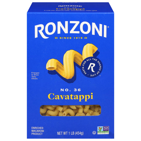 Enriched macaroni product. A low fat, sodium free, cholesterol free food. Non GMO Project verified. nongmoproject.org. Since 1915. Contents may settle. Product sold by weight not volume. Inspired by our Italian heritage and made for Americans, Ronzoni pasta has been part of family meals for 100 years. Made from simple, quality ingredients, our pasta continues to be the foundation for delicious, wholesome meals, enjoyed by generation after generation. Ronzoni. The that calls America home. Ronzoni is so good. www.ronzoni.com. For delicious recipes and cooking tips, visit www.ronzoni.com. Questions or comments, visit our website or call 1-800-730-5957. Product of USA.