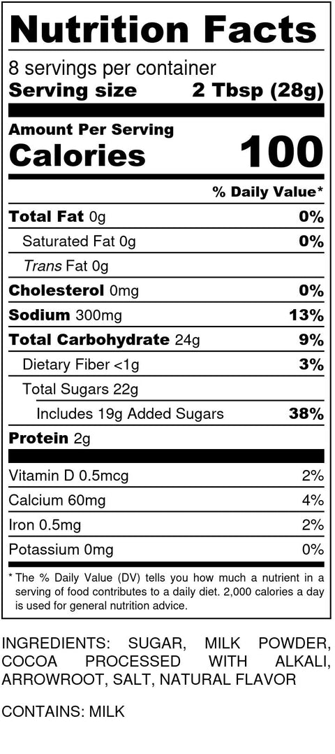 Ingredients: Sugar, Milk Powder, Cocoa, Arrowroot, Caramel Flavor, Salt