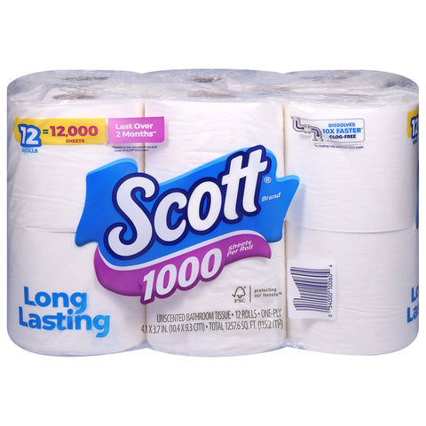 4.1 x 3.7 in. (10.4 x 9.3 cm). Total 1257.6 sq. ft. (115.2 sq m). 12 rolls = 12,000 sheets. 12 rolls last 12 weeks (based on avg. household size and usage of Scott 1000 users). 1000 sheets per roll. Clog free. Septic safe. scottbrand.com. how2recycle.info. 1-800-835-7268. Please have a roll from the package when you call. Kimberly-Clark Corp. Dept. SBW-12 P.O. Box 2020 Neenah, WI 54957-2020 USA. Make your family a Scott family. Rapid-dissolving. Comfort Plus. Paper Towels. Flushable. FSC: Mix - Paper from responsible sources. www.fsc.org. Made in Mexico. Printed in Mexico.