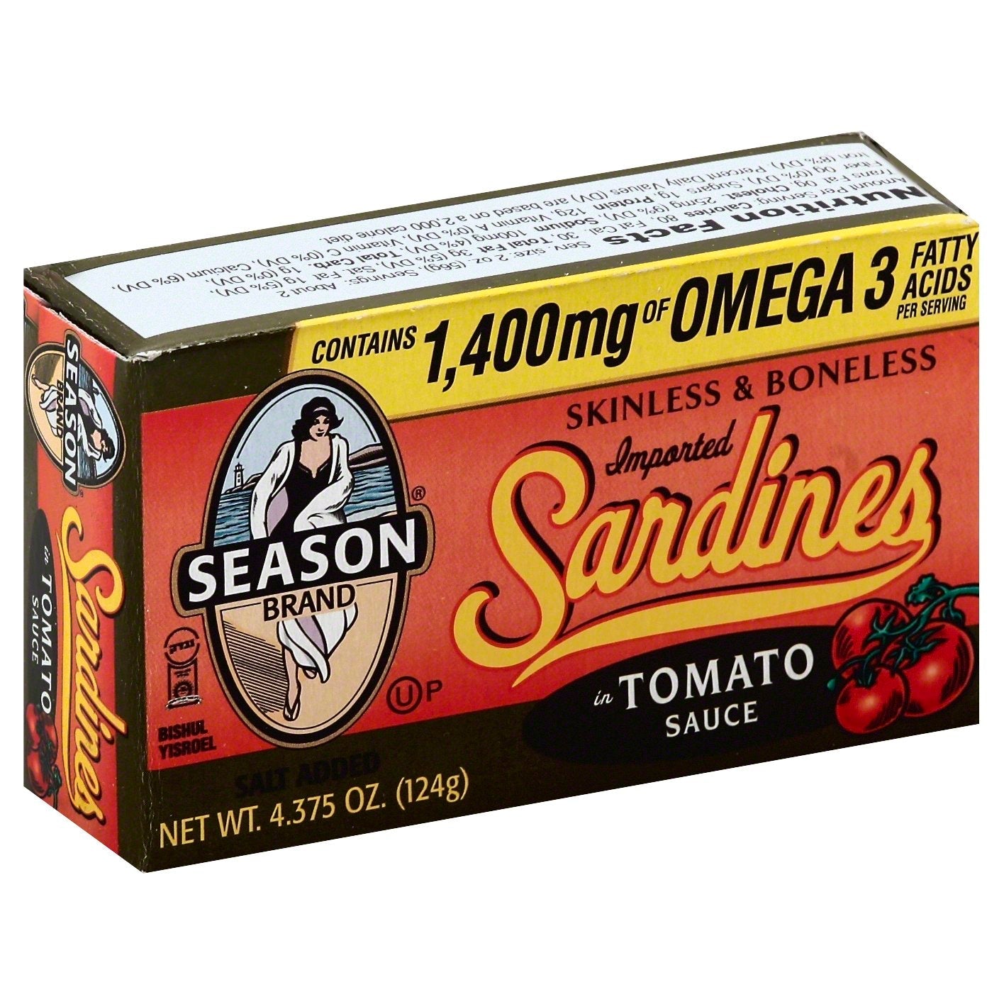 Contains 1,400 mg of omega 3 fatty acids per serving. Imported. Season skinless & boneless sardines are harvested from the cold waters of the Atlantic Ocean off the coast of Morocco and packed in a rich tomato sauce to ensure they are at their flavorful best. And don't forget skinless and boneless sardines are healthy for you - a natural source of omega 3's and protein. Enjoy Season sardines as a snack, in a salad, or as part of your favorite recipe! Visit us at www.seasonproducts.com for delicious recipes and more! Contains 1,400 milligrams of omega-3 fatty acids per serving and is high in protein and calcium. See nutrition facts for total and saturated fat content. Wild caught. Product of Morocco.